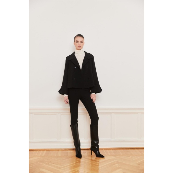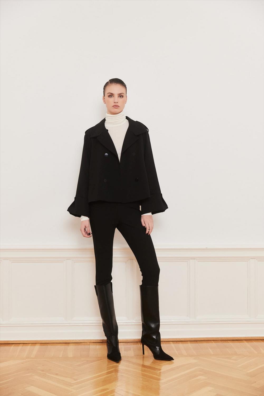 Denne avskårne silhuetten har skarpe folder bak for en slående, skulpturell effekt, og viser frem IBENS signatur, nemlig overdimensjonerte, oppbrettede mansjetter, en dristig detalj som skiller den fra andre jakker.