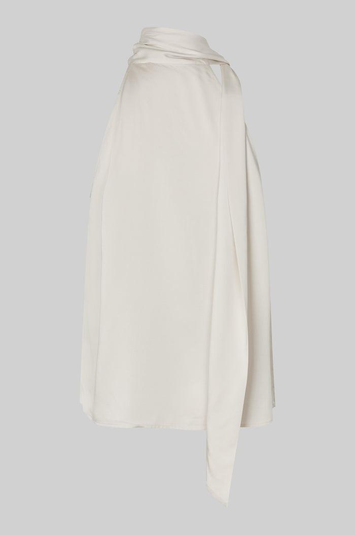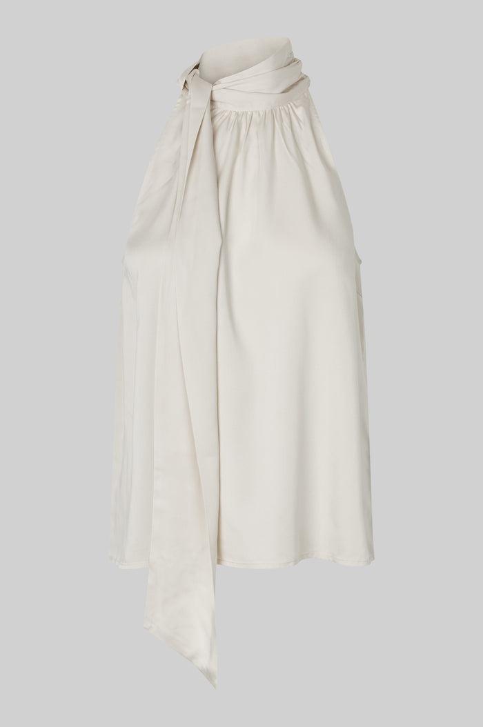Second Female ermeløs bluse med høy hals. Blusen er laget i en silkemyk viskose-tencel-blanding. Har høy hals med knytebånd i den ene siden. Normal passform.